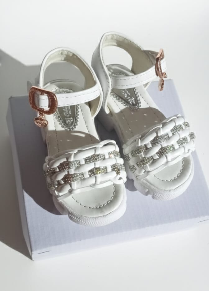 A high-resolution product shot of a pair of elegant white children’s sandals
