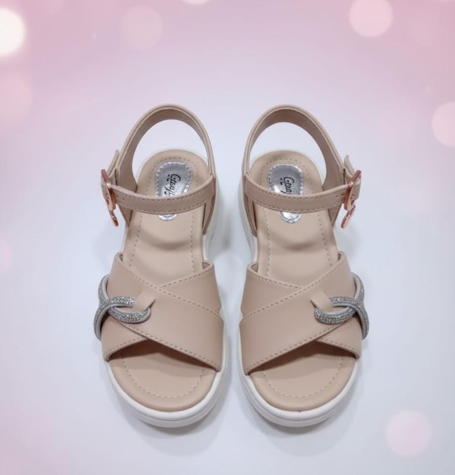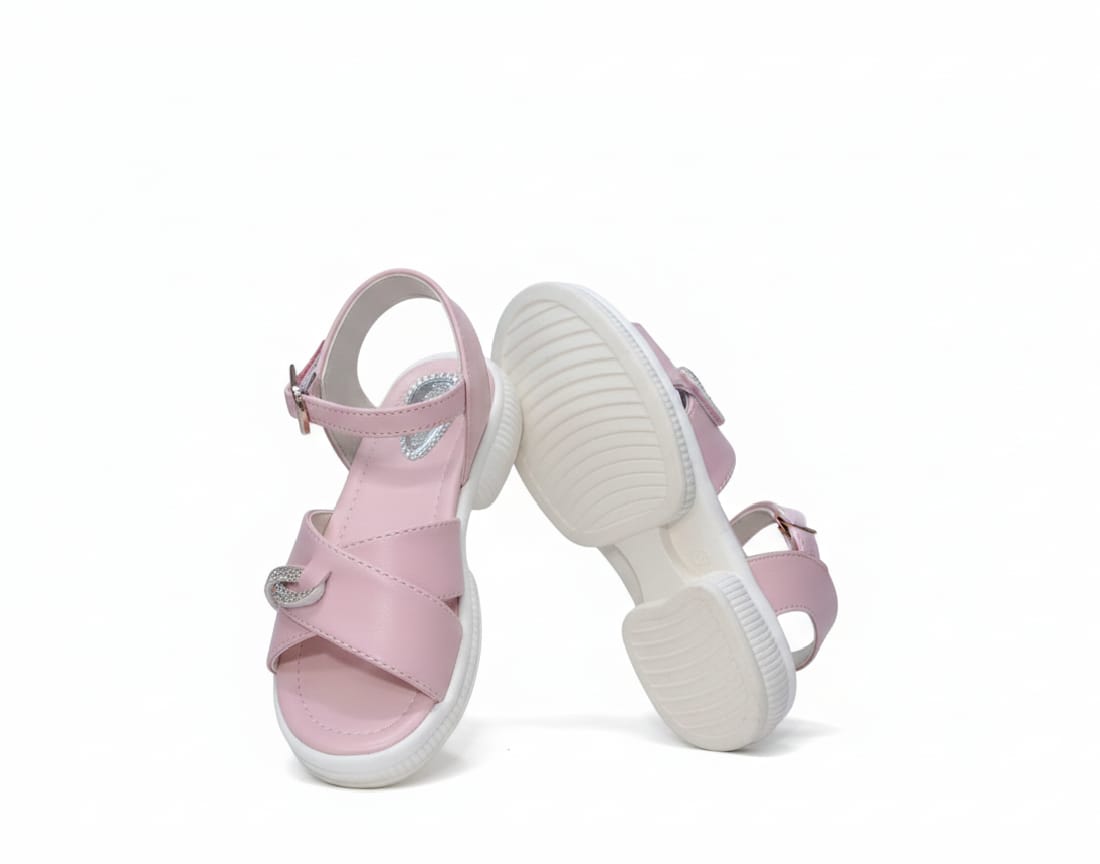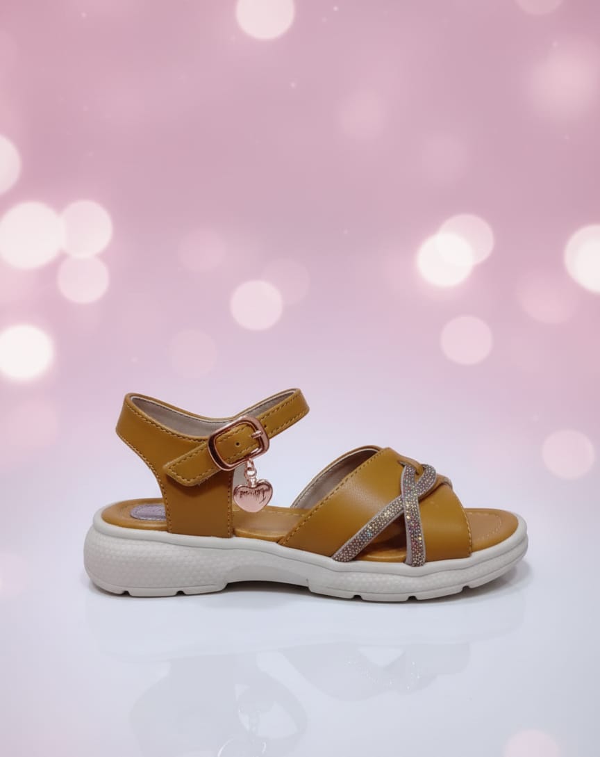 “Aesthetically pleasing shot of trendy leather sandals for kids. The sandals have a unique sparkling silver twist on the front strap